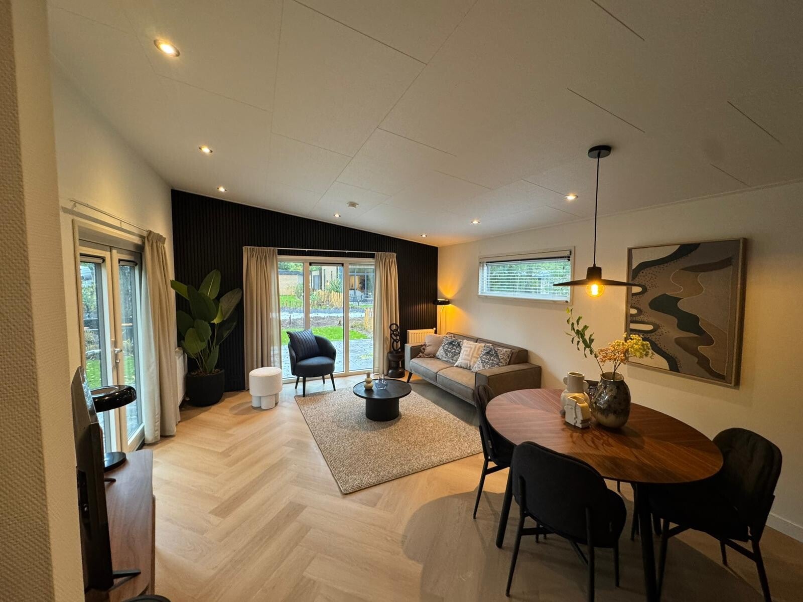 In de sfeervolle woonkamer vind je een moderne LG Smart TV. Perfect om na een dag vol avonturen op de Veluwe lekker te ontspannen met je favoriete serie of film.